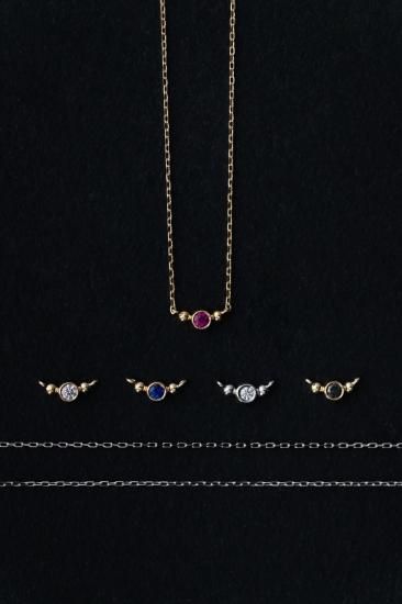 ルビーのサイドに丸い球をあしらった、シンプルながらも少し遊び心の入ったデザイン。